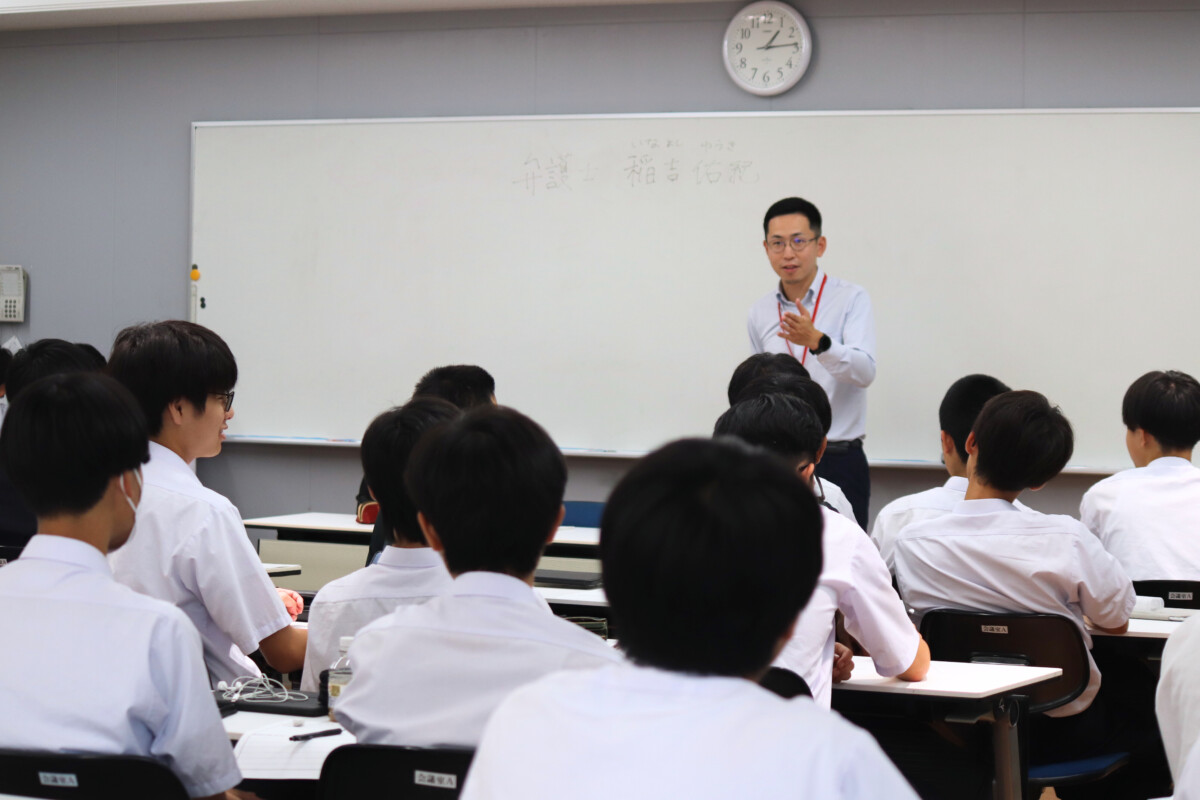 特進英数コース2年生を対象に、社会探究授業の一環として、福岡県弁護士会所属の稲吉佑紀弁護士をお招きし、法学に関する講義を行いました。
