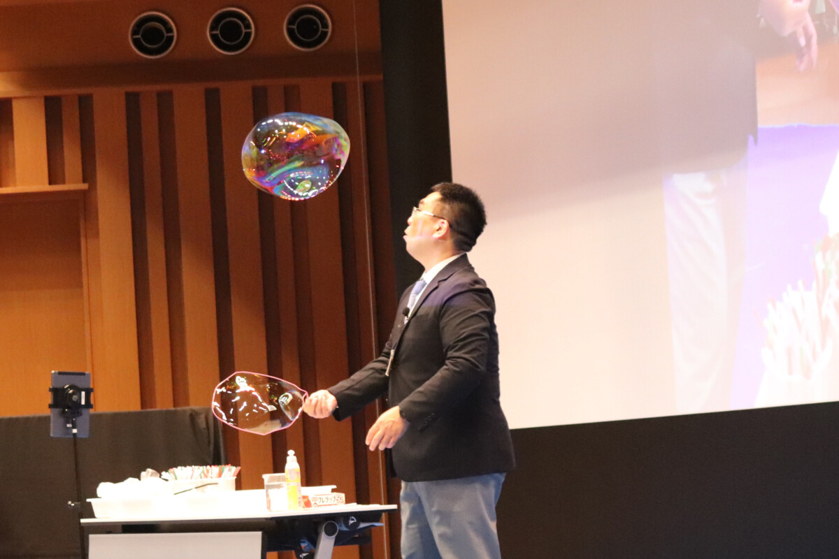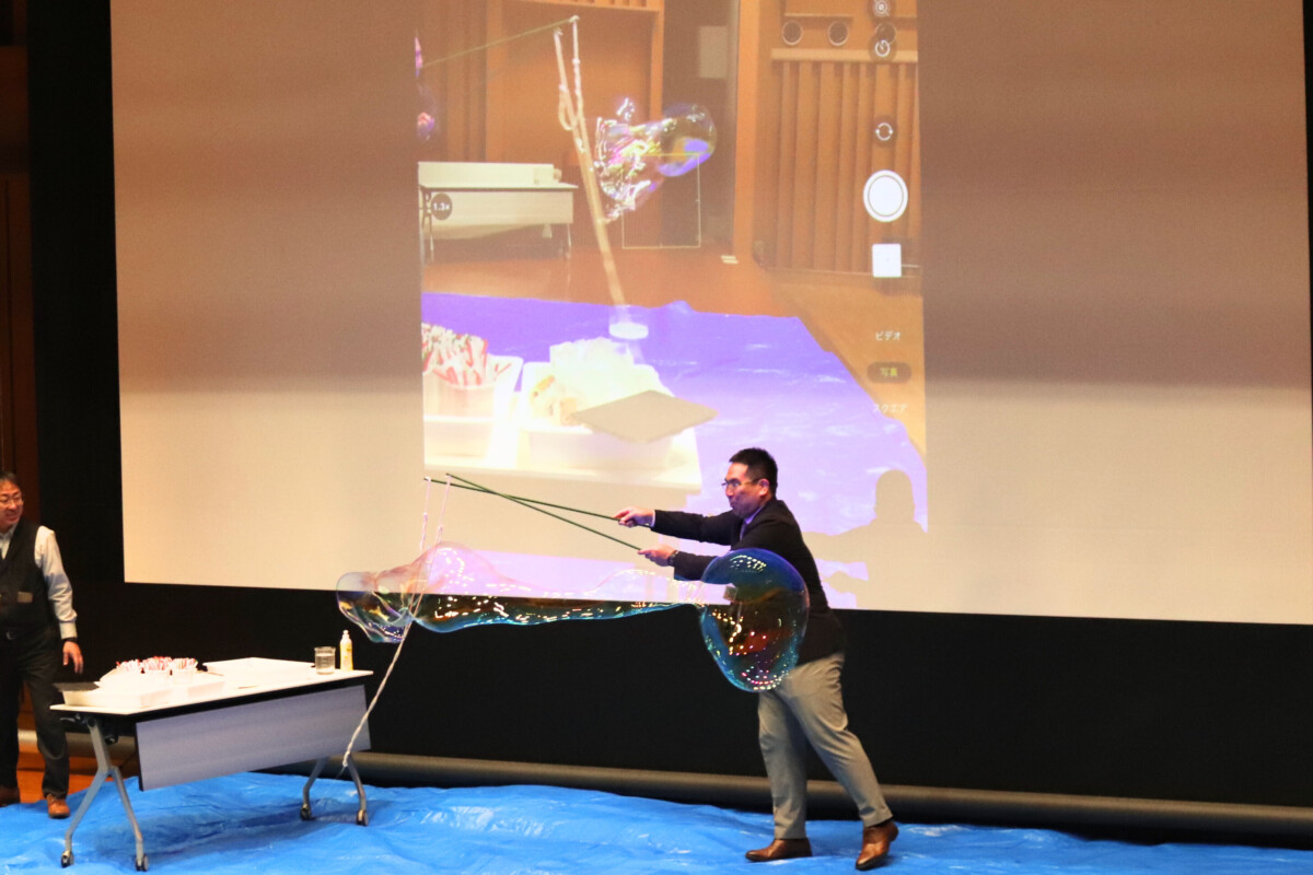 :理科教員によるシャボン玉実験のほか、ストロー笛づくりが好評で、完成した笛は希望者全員に配布しました。