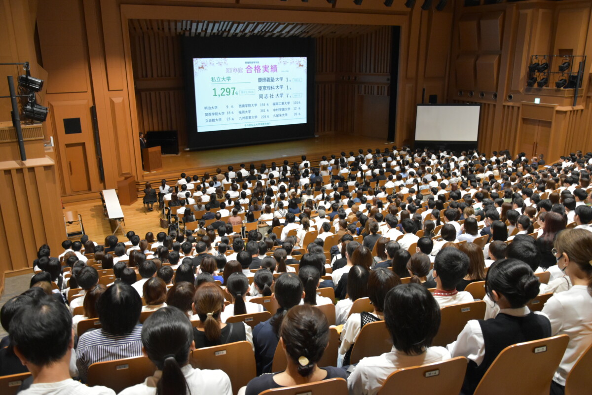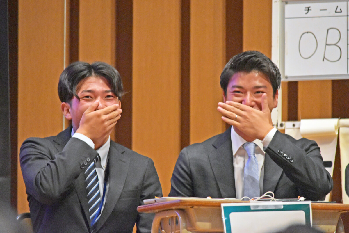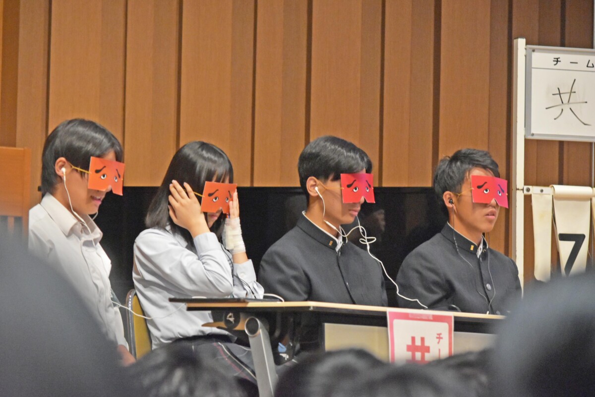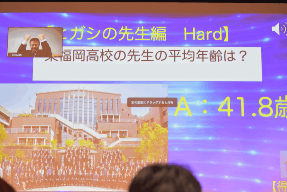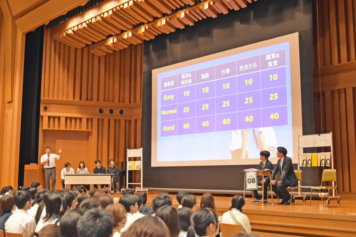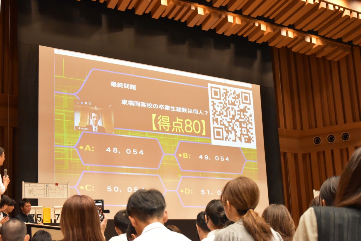 今回初めて行ったこの企画は、チーム1年生(共学)、チーム2年生(男子校)、チームOB、チーム会場の4組に分かれ、東福岡高校にまつわるクイズで得点を競うというものです。