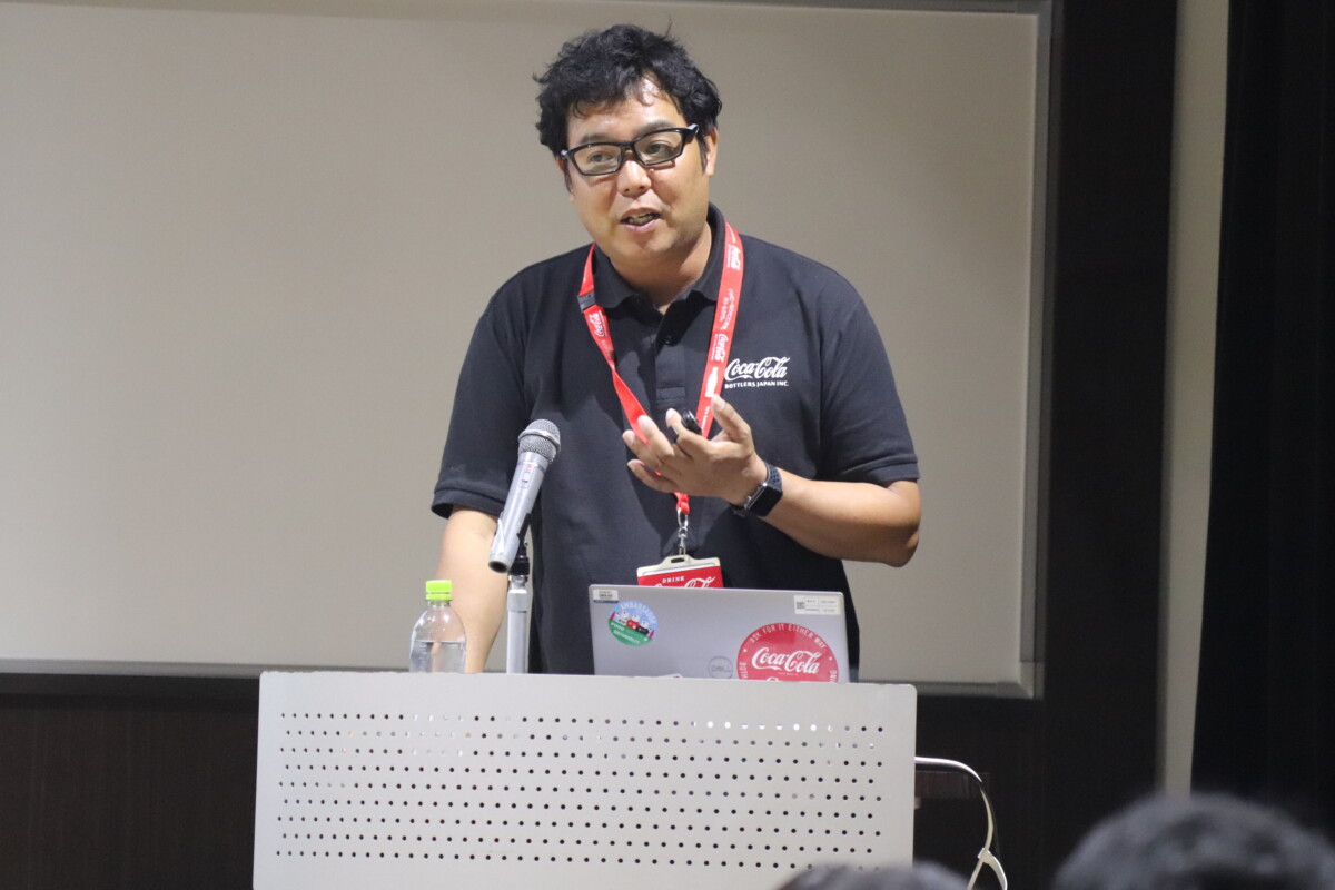 午後からは、コカ・コーラ ボトラーズジャパン株式会社の藤久保敦士さんを講師にお迎えし、企業がSDGs達成に向けて取り組む実例についてお話しいただきました。