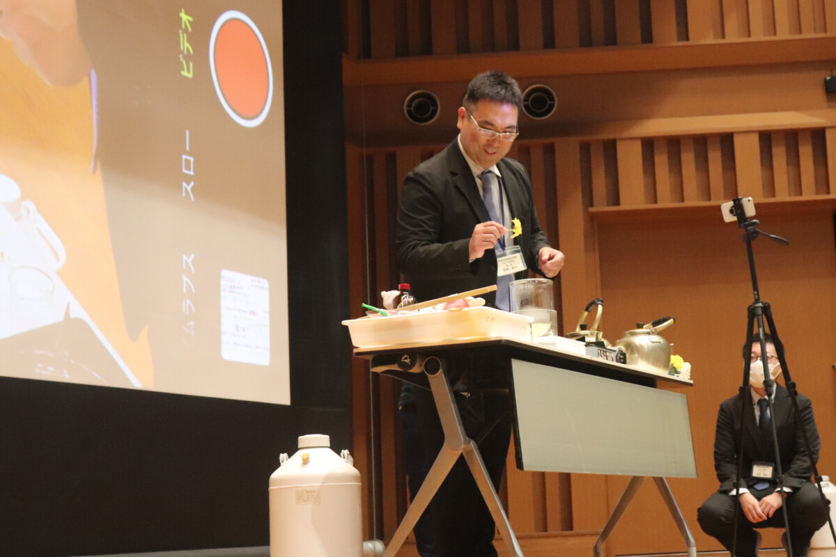理科実験ではステージ上に希望の小学生も壇上し、液体窒素や指に火をつける実験など楽しい実験に会場は笑顔に包まれました。