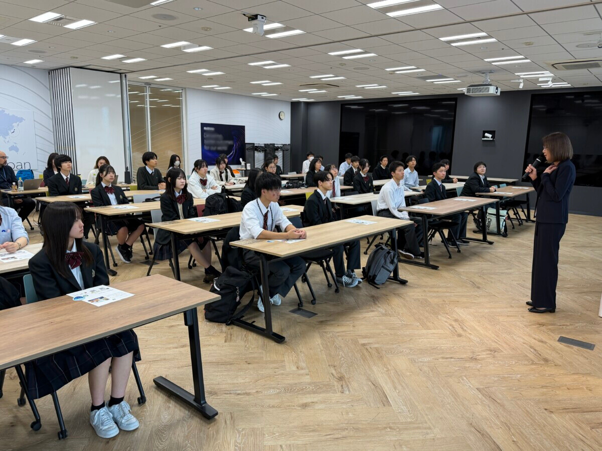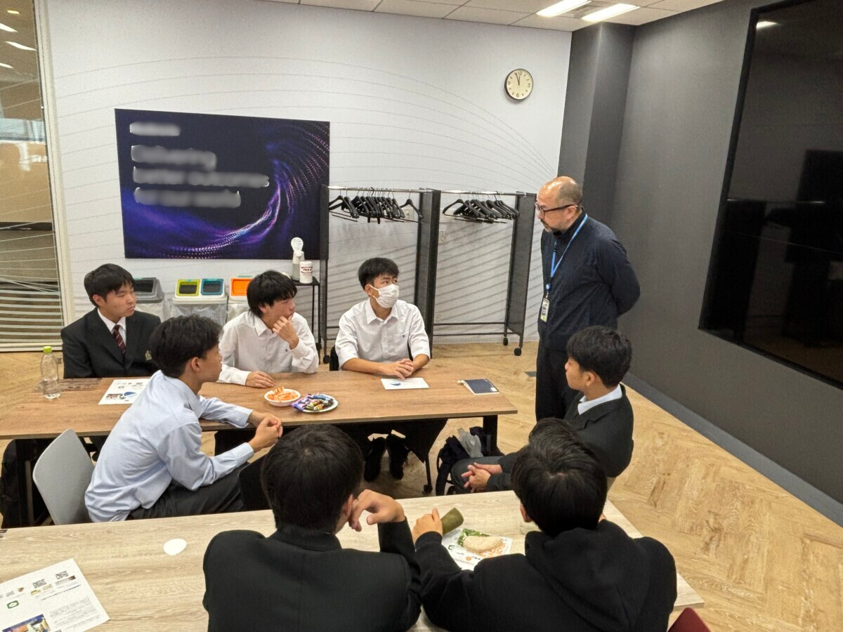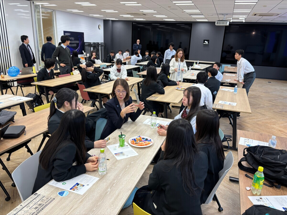 生徒5、6人に対して社員1名がついて社内見学をさせてもらい、さらに、一緒に昼食をとることで、社員の方の仕事内容・キャリア観に触れ、志をもって興味のある領域で社会に貢献する姿勢に触れることができました。
