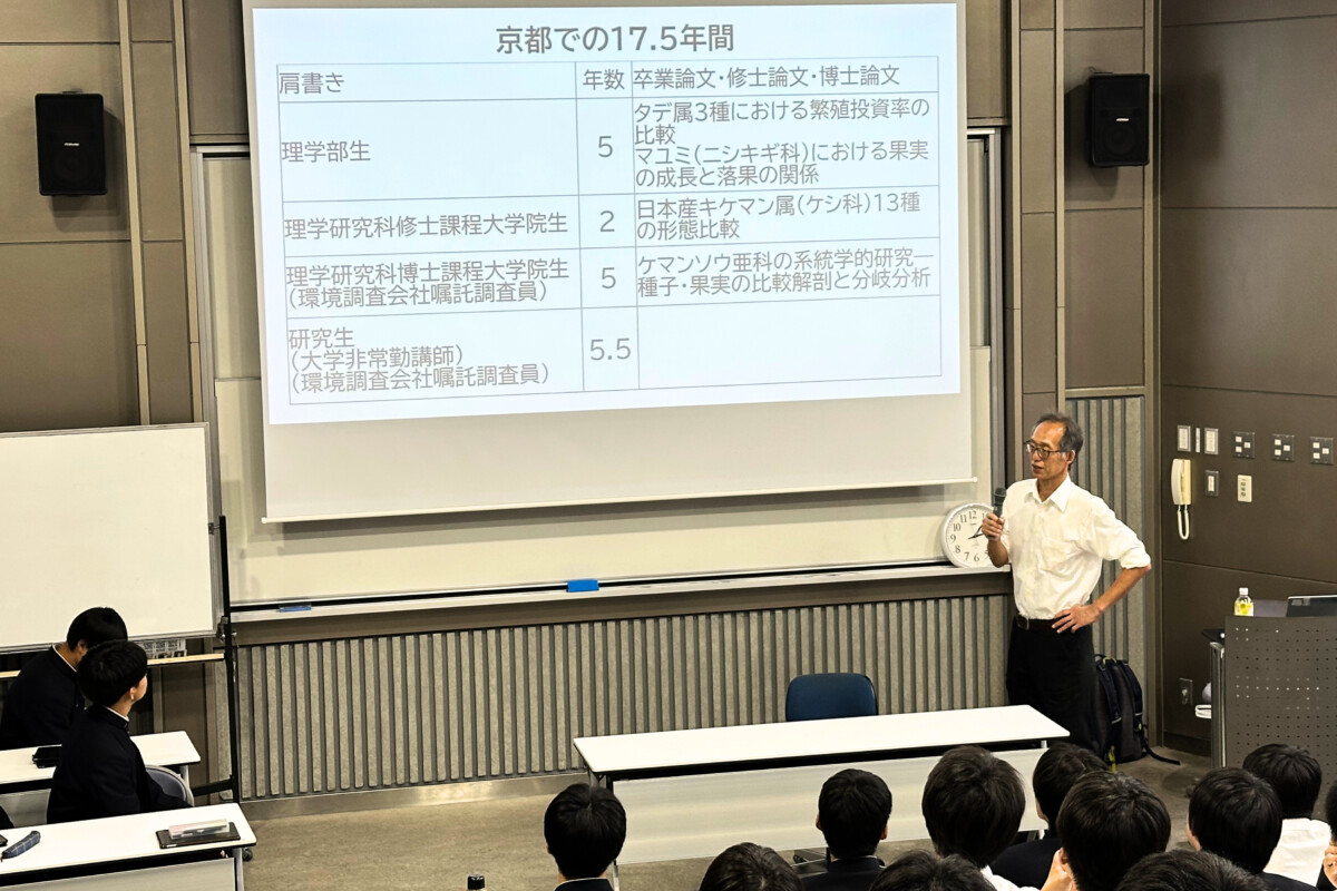 生徒たちは、福原教授が2年間にわたりノグルミの開花状況を継続的に調査し、送粉者である体長わずか2mmのアザミウマを電子顕微鏡で観察する研究の様子を紹介され、ひとつの疑問に粘り強く向き合う研究の姿勢に強い印象を受けていました。