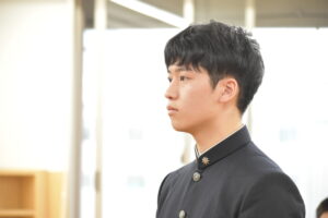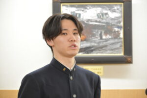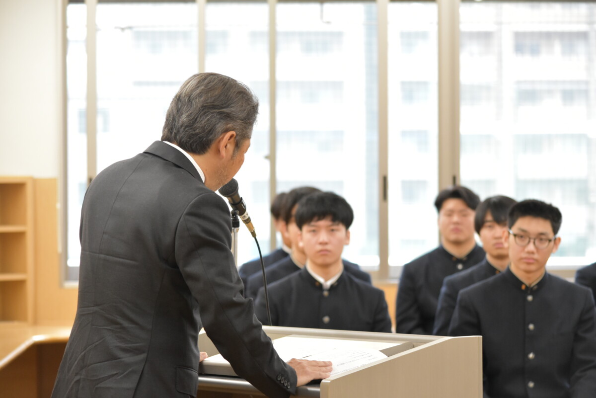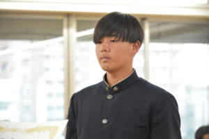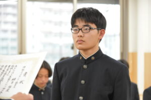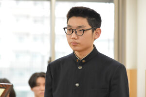 同窓会長の宮房武亮様からご挨拶をいただき、生徒を代表して前生徒会長事務局長・園田くんが